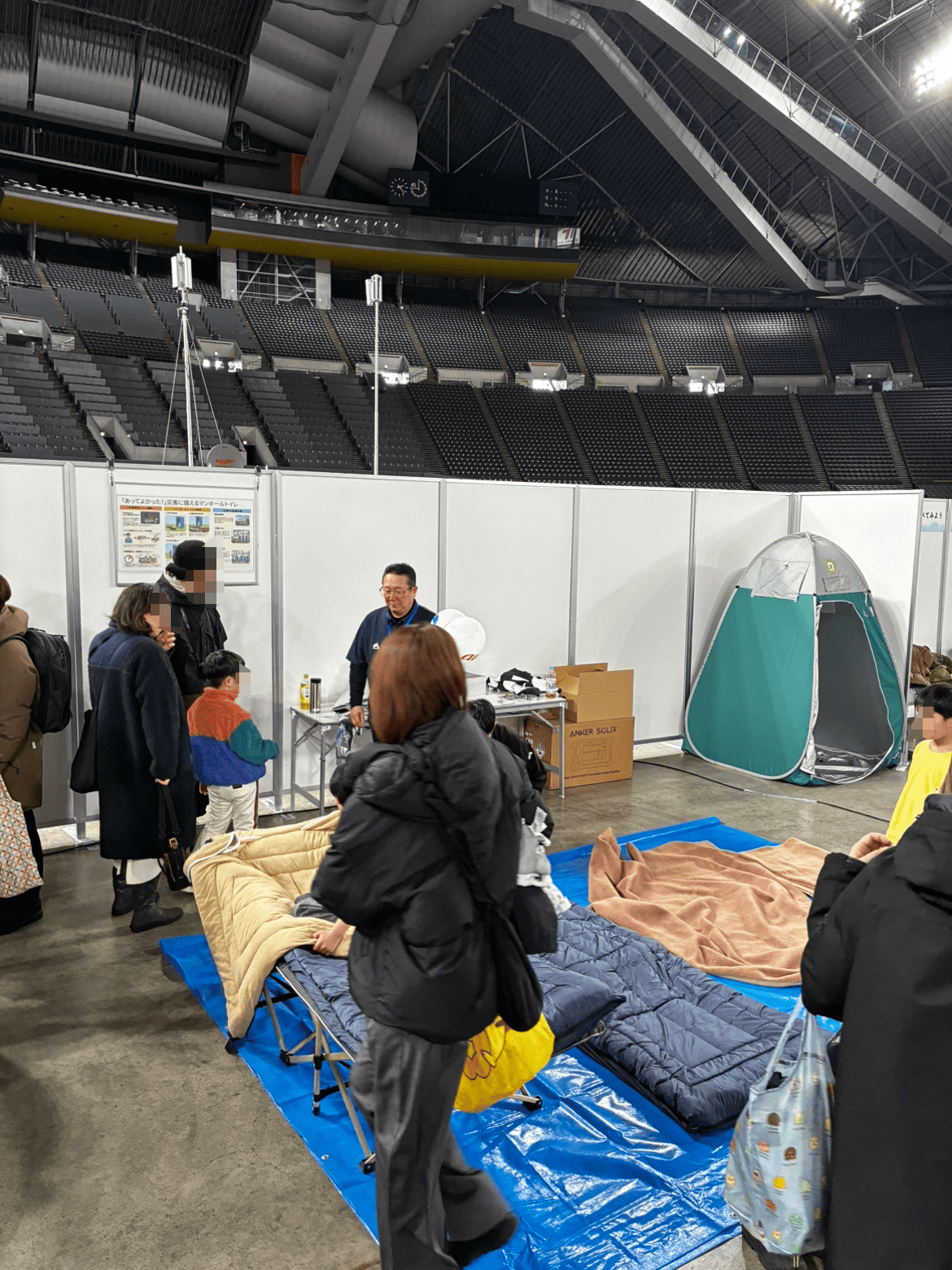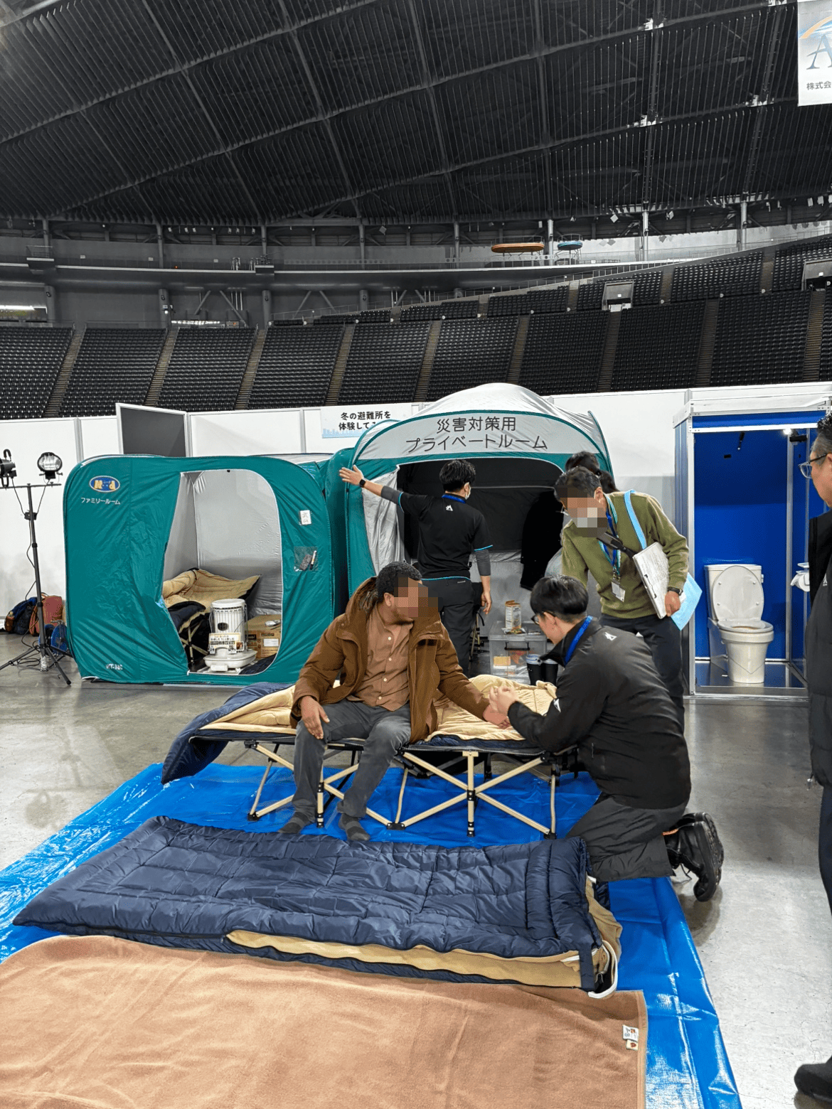 の2つのブースを出展し、実際の避難環境をイメージしながら、防寒対策や寝具、生活空間の確保などについて体験・説明を行いました。